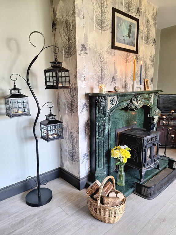 Inside, the accommodation is spacious and full of character. The entrance hall is spacious in nature with the Sitting Room located off same. This room features a beautiful solid fuel stove with marble surround and a large window framing views of the front garden. The kitchen/dining area is bright and inviting, with dual aspect windows overlooking the rear garden, built-in units including a glass display cabinet, patio doors, and a traditional solid fuel range?perfect for cosy family living. A separate utility room is conveniently located just off the kitchen.