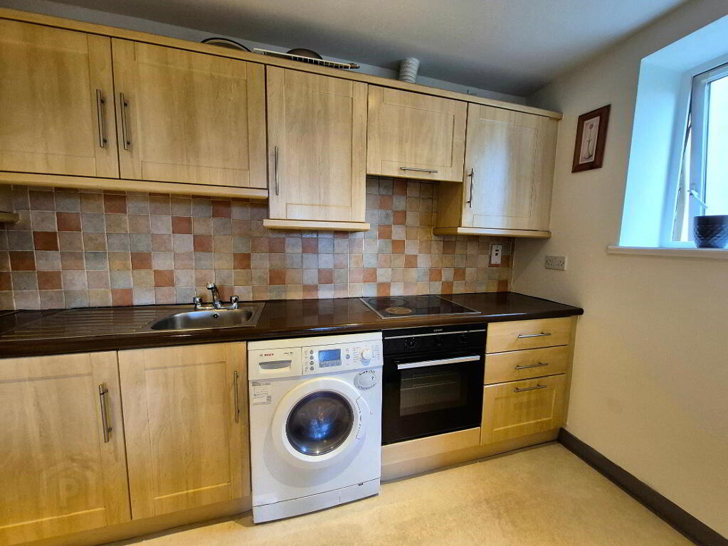 The accommodation comprises an entrance hall leading to a large sitting room with an open fireplace, side-facing window, and south-facing patio doors that open directly onto the sunny balcony. Off the sitting room lies the galley-style kitchen, accessed through elegant double glass-panelled doors. It is fitted with contemporary base and eye-level units, a built-in cooker, hob, extractor fan, and is plumbed for a washing machine. An additional side-facing window fills the space with natural light.