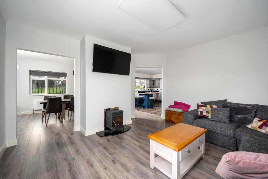 The lounge area located just off the kitchen continues the open-plan flow and features a solid fuel stove, creating a cosy and relaxing atmosphere. Off the kitchen, you?ll also find a well appointed utility room and a convenient guest WC.