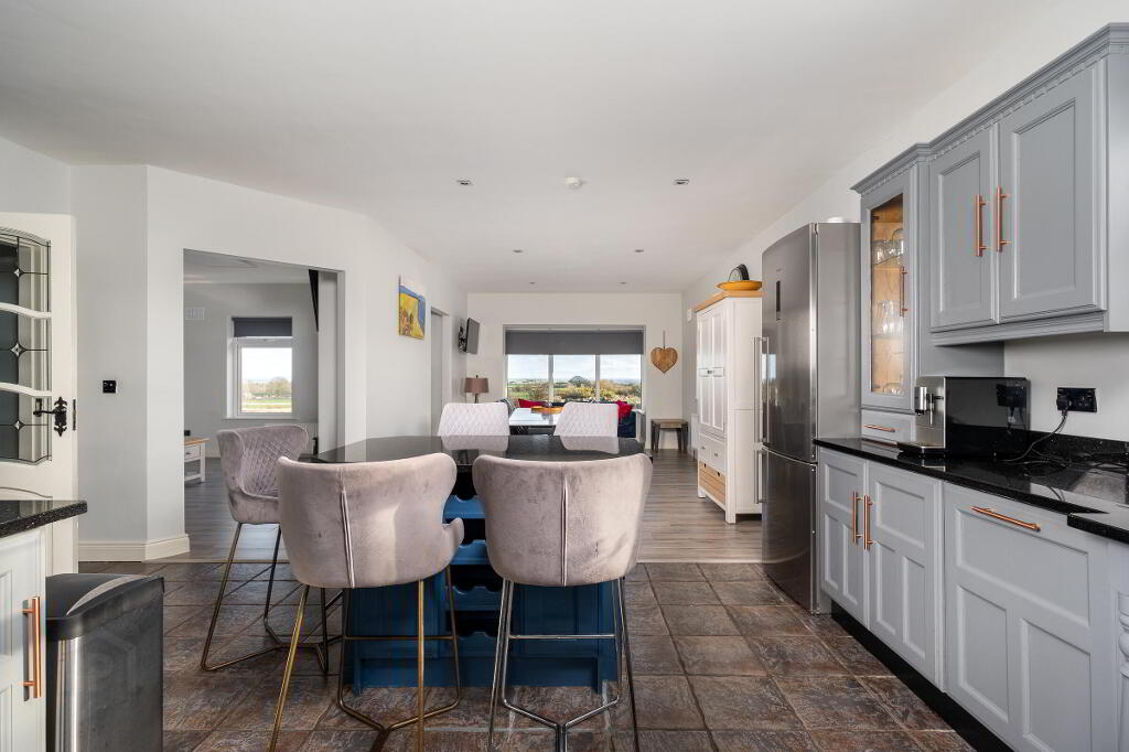 Step through the front door into a large, light-filled entrance hall, which sets the stage for the warm and inviting interior beyond. The kitchen/dining room spans the full width of the home, a magnificent open-plan space designed for both family living and entertaining. It features bespoke fitted kitchen units, a granite worktop and a central island with seating, perfect for casual dining. Multiple windows, including a beautiful bay window flood the room with natural light and offer stunning views of the surrounding countryside.