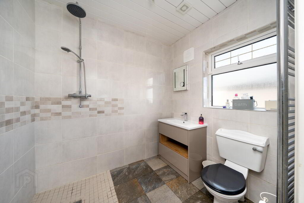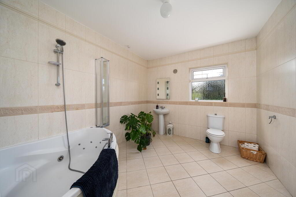 A bright, spacious hallway with a beautifully tiled floor leads to an impressively sized main bathroom, complete with a corner jacuzzi bath, WC, and wash-hand basin. The ground floor also hosts four large, light-filled bedrooms, each featuring floor-to-ceiling built-in wardrobes. The master bedroom is further enhanced by a charming bay window, extensive wardrobe space, and a private wet room ensuite.