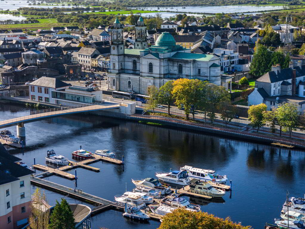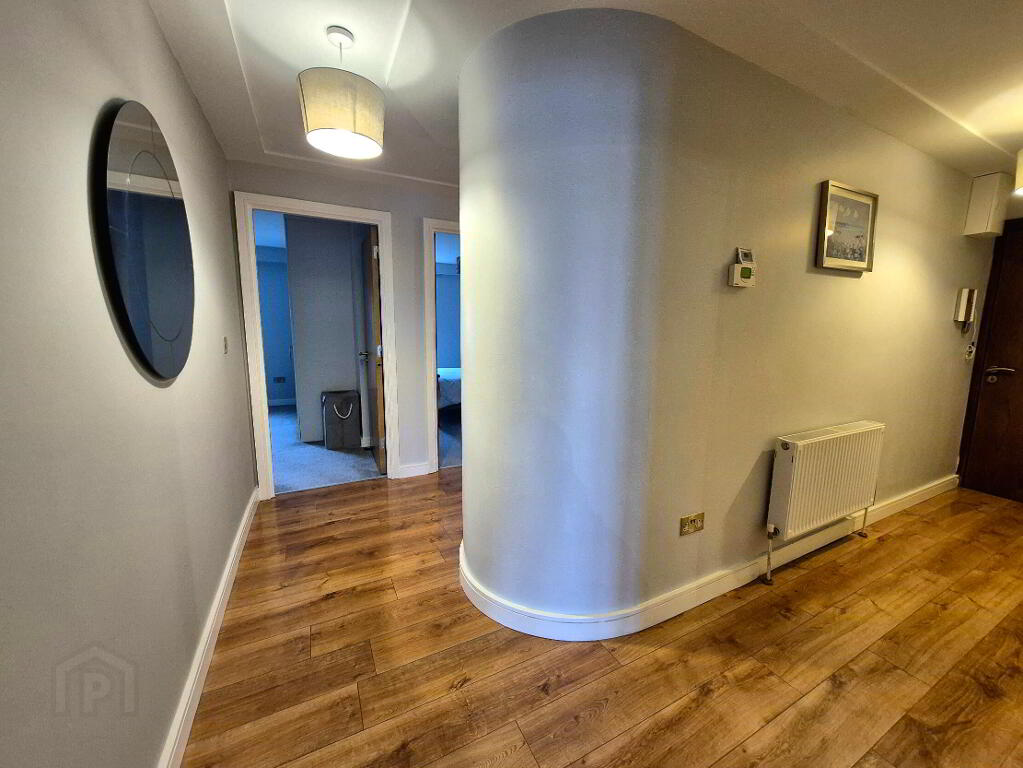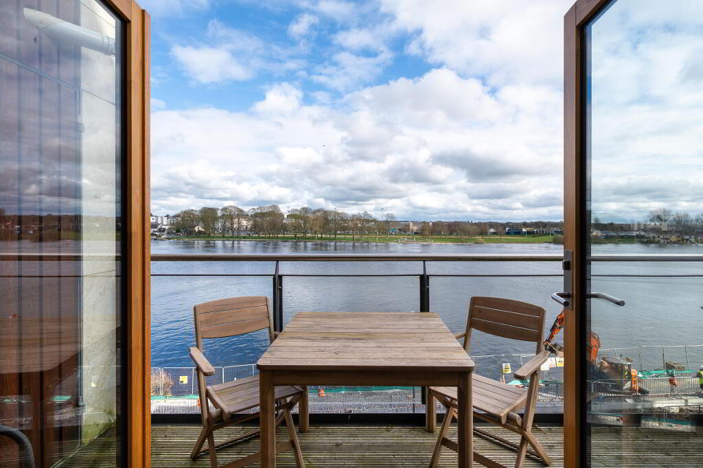 Situated on the second floor of the prestigious Bastion Quay development, this exceptional three bedroom apartment offers refined living in one of Athlones most sought after waterfront locations, with uninterrupted views over the River Shannon. Upon entering, you are greeted by an impressive entrance hall featuring a striking curved feature wall, immediately setting the tone for the quality and design that flows throughout the apartment. The heart of the home is the elegant open plan kitchen, dining and living area. The stylish galley kitchen is finished with ample bespoke grey built in units and enhanced by carefully selected designer ceiling lighting. High end appliances include an integrated fridge freezer, dishwasher and a dedicated wine fridge, creating a space that is both functional and sophisticated. A kitchen window overlooks the side of the building, allowing for additional natural light. The living and dining area is generously proportioned and beautifully framed by floor to ceiling patio doors, which open directly onto a large private balcony. From here, residents can enjoy breathtaking views of the River Shannon, take in the stunning scenery and watch boats glide by, a truly tranquil and luxurious setting rarely available.
