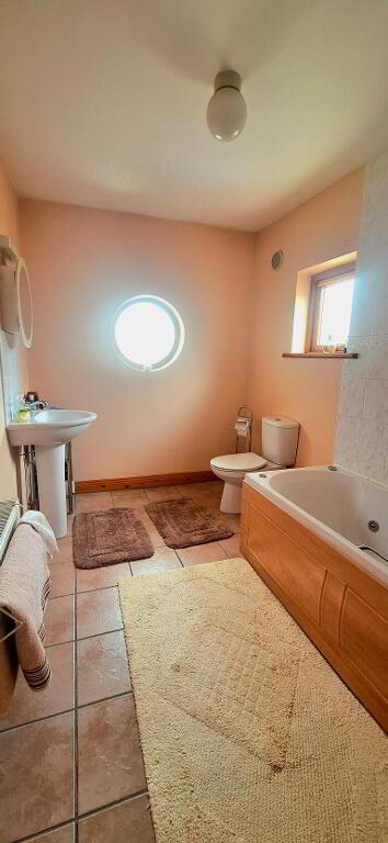The main bathroom features dual aspect windows, including a nautical-style circular window, filling the space with natural light.