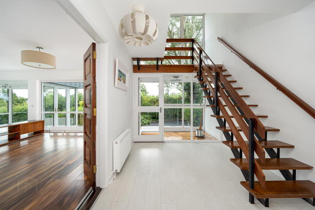 From here you enter a double height volume light filled entrance hall with floor to ceiling glazing at both levels. The original Mid Century style open staircase allows light to flush through the Entrance Hall unimpeded.